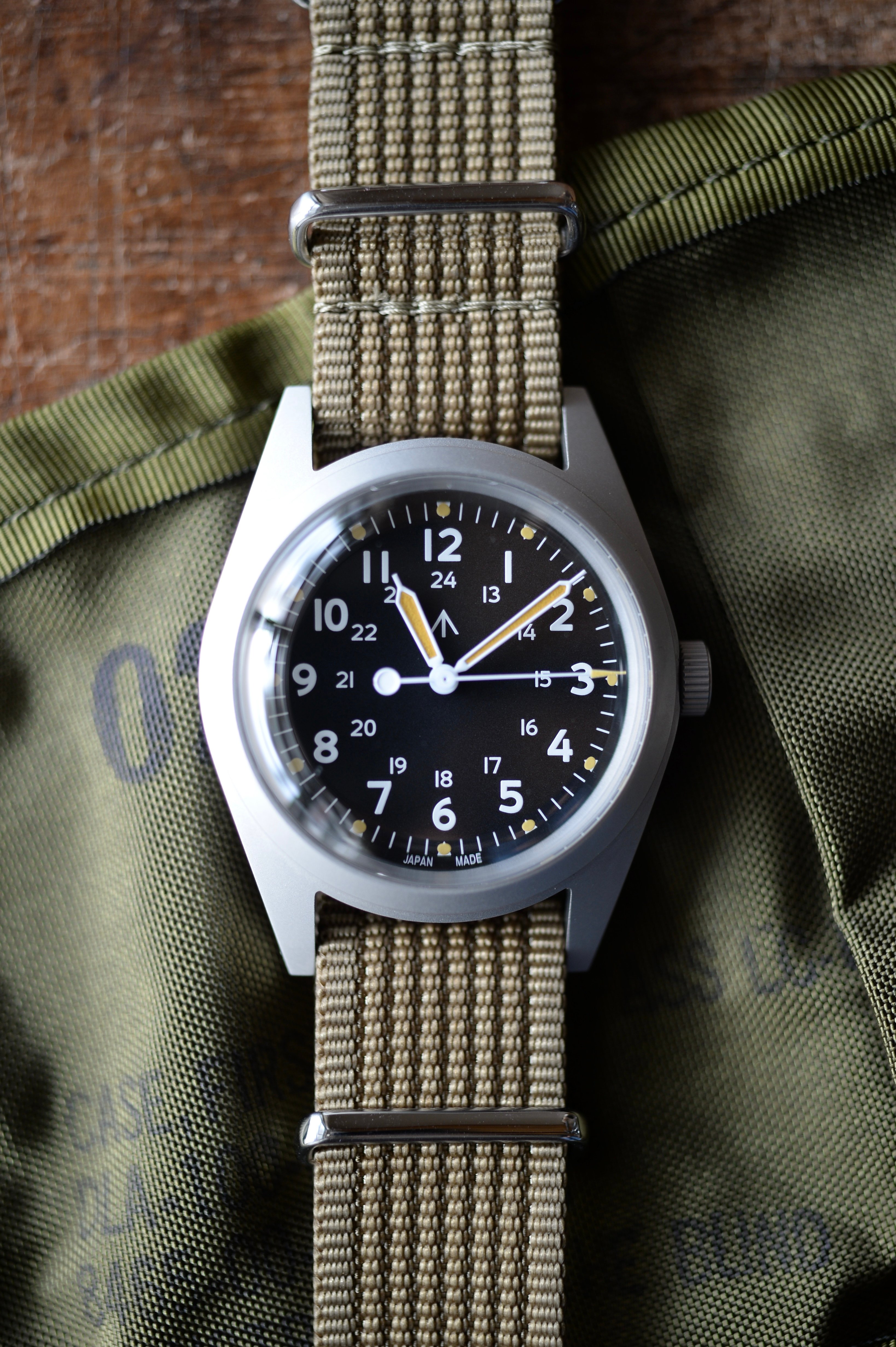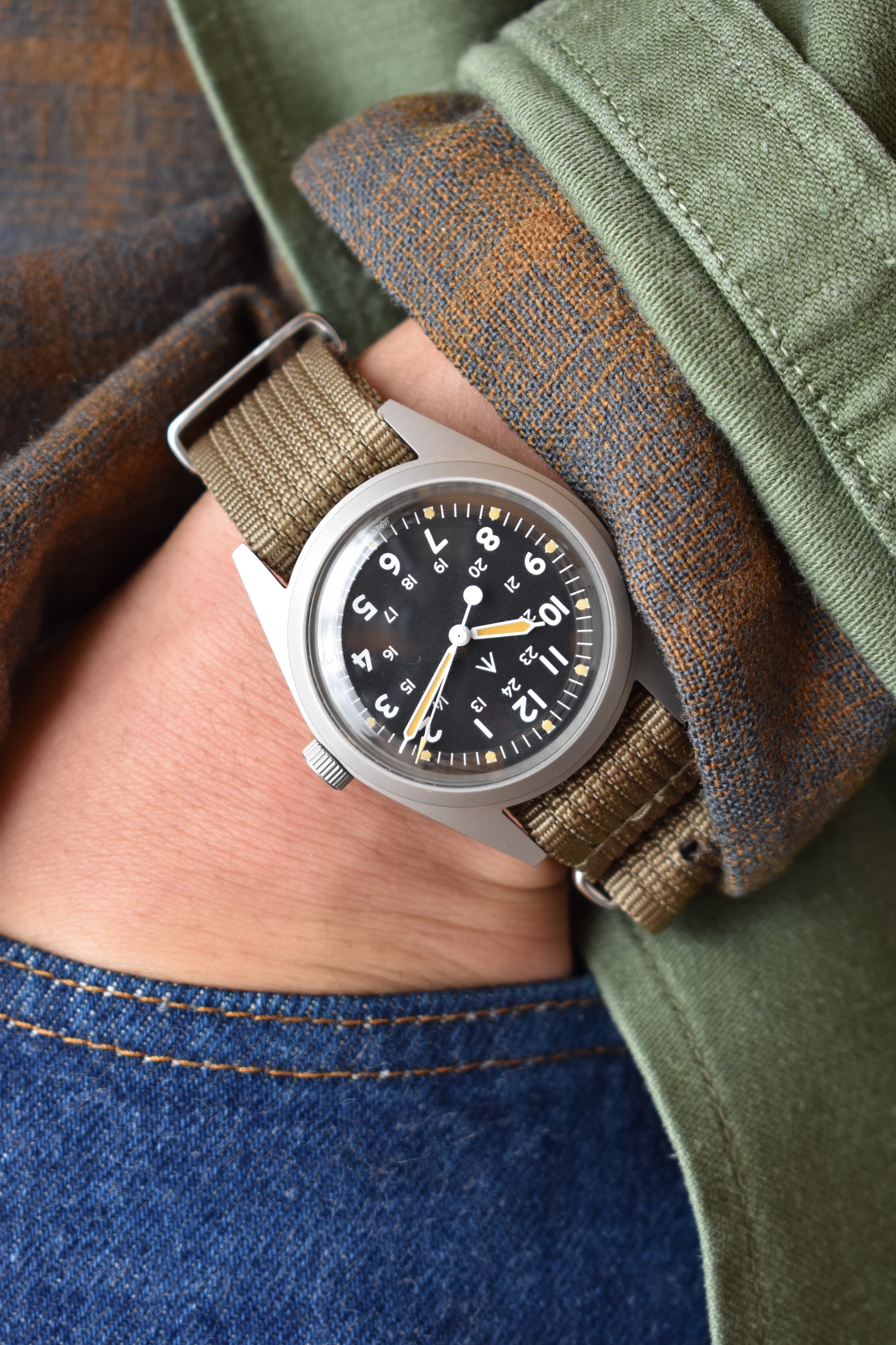 ベトナムウォッチは市民権を得た普遍的なスタイルであり、いわば “キング・オブ・ミリタリーウォッチ” と呼べる存在です。簡単に触れると、60〜70年代のベトナム戦争期にアメリカ軍が複数の時計メーカーへ要請して兵士に支給した腕時計がルーツで、低コストでありながらフィールドに適したデザインや機能を備えた、まさに道具としてのミリタリーウォッチです。