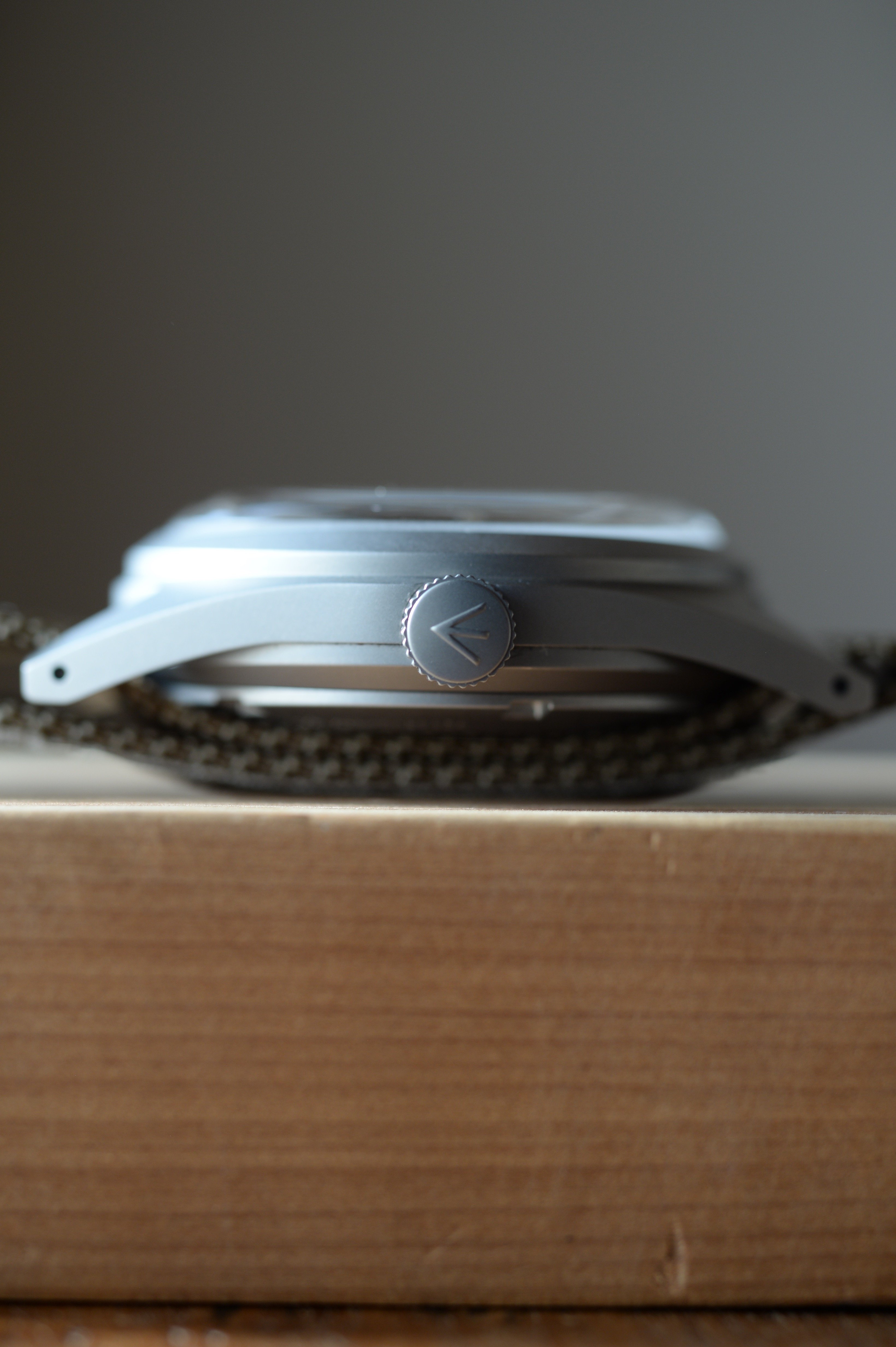 リューズには、ナバルウォッチのブランドロゴであるブロードアローを凹凸で表現しました。