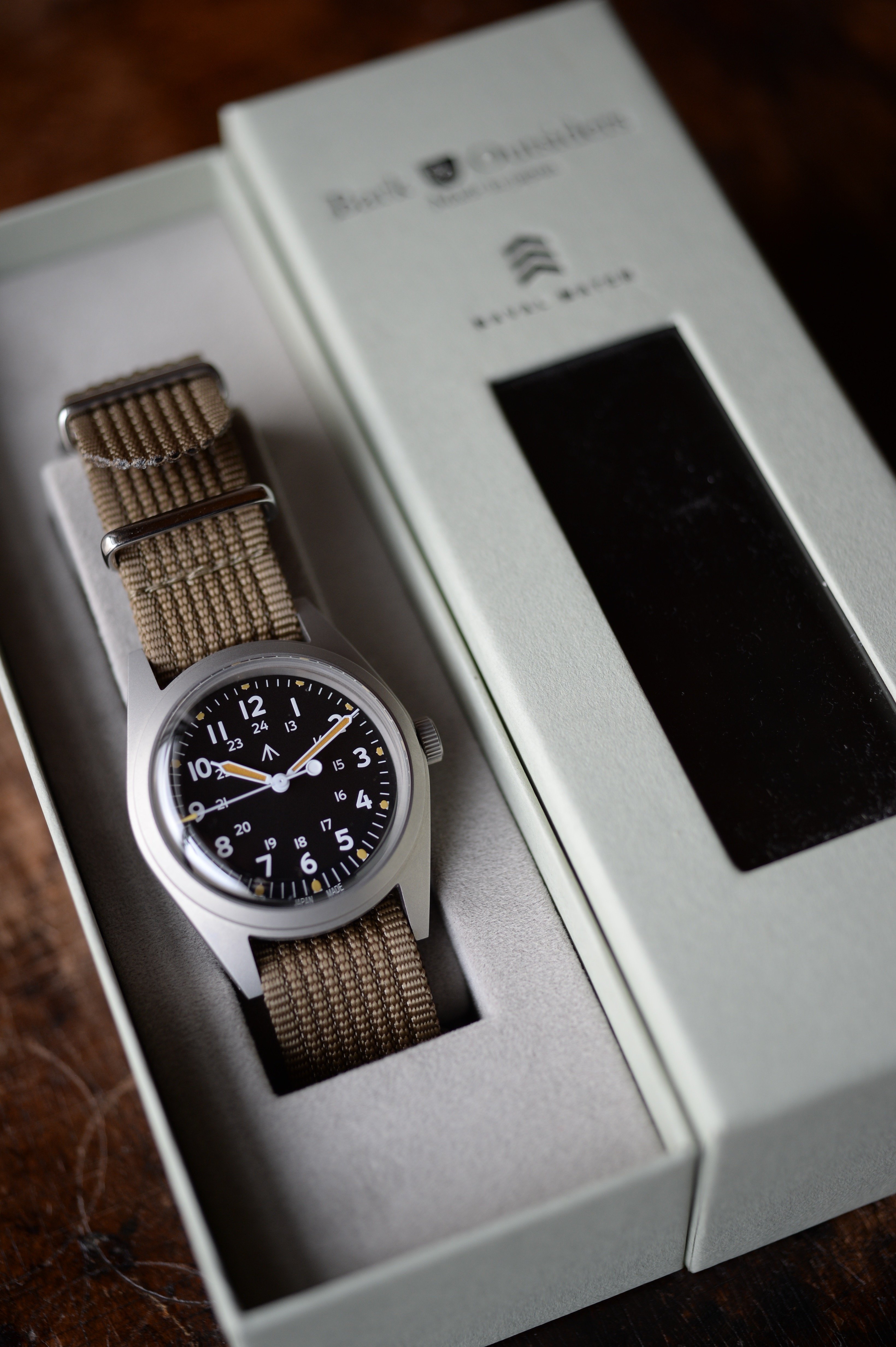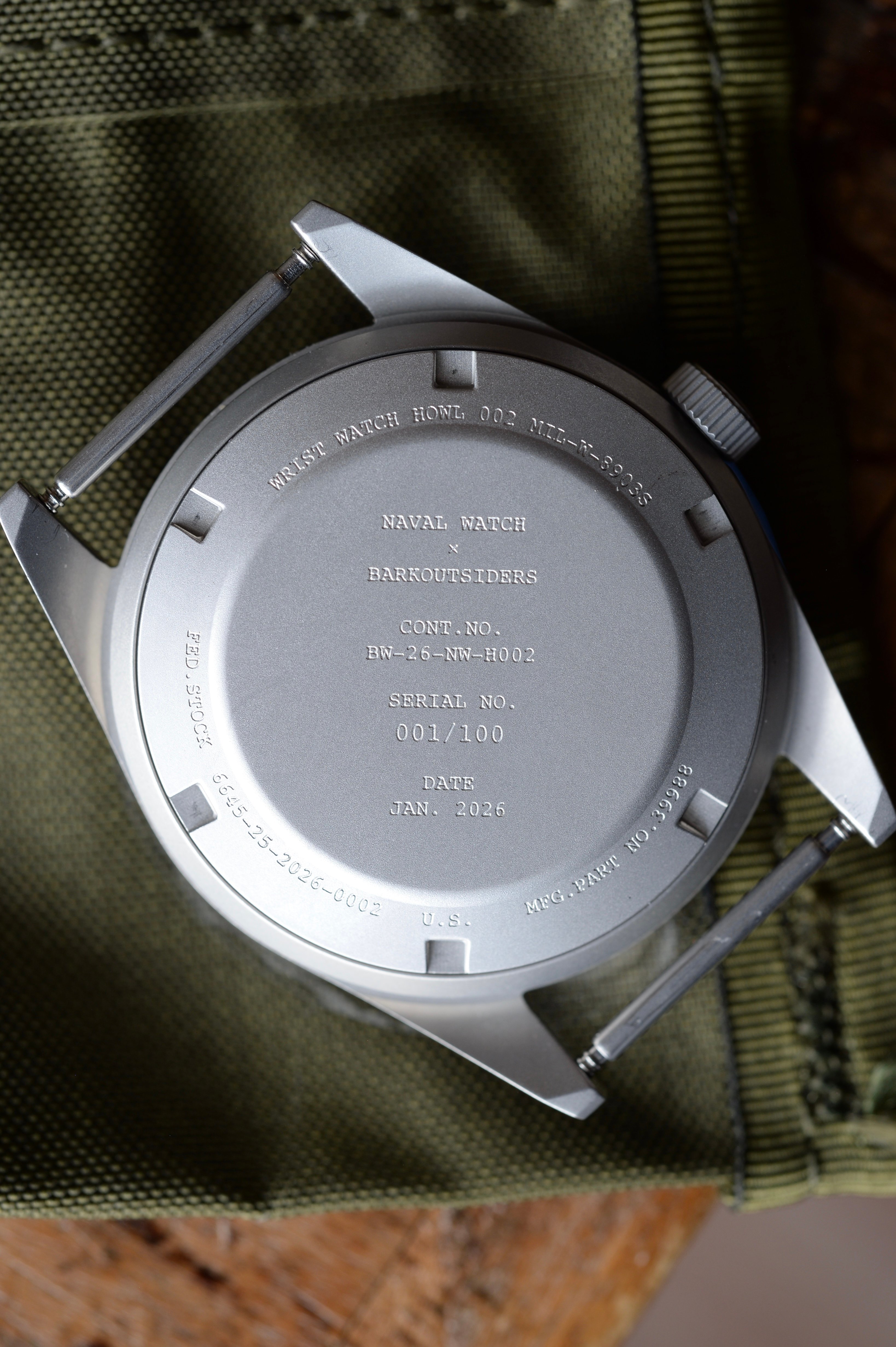ラウンド状にテキストが配されたケースバックは、GG-W-113の原型にあたるMIL-W-3818に見られる特徴であり、深いエッジングによる刻印の存在感に強く惹かれてきました。