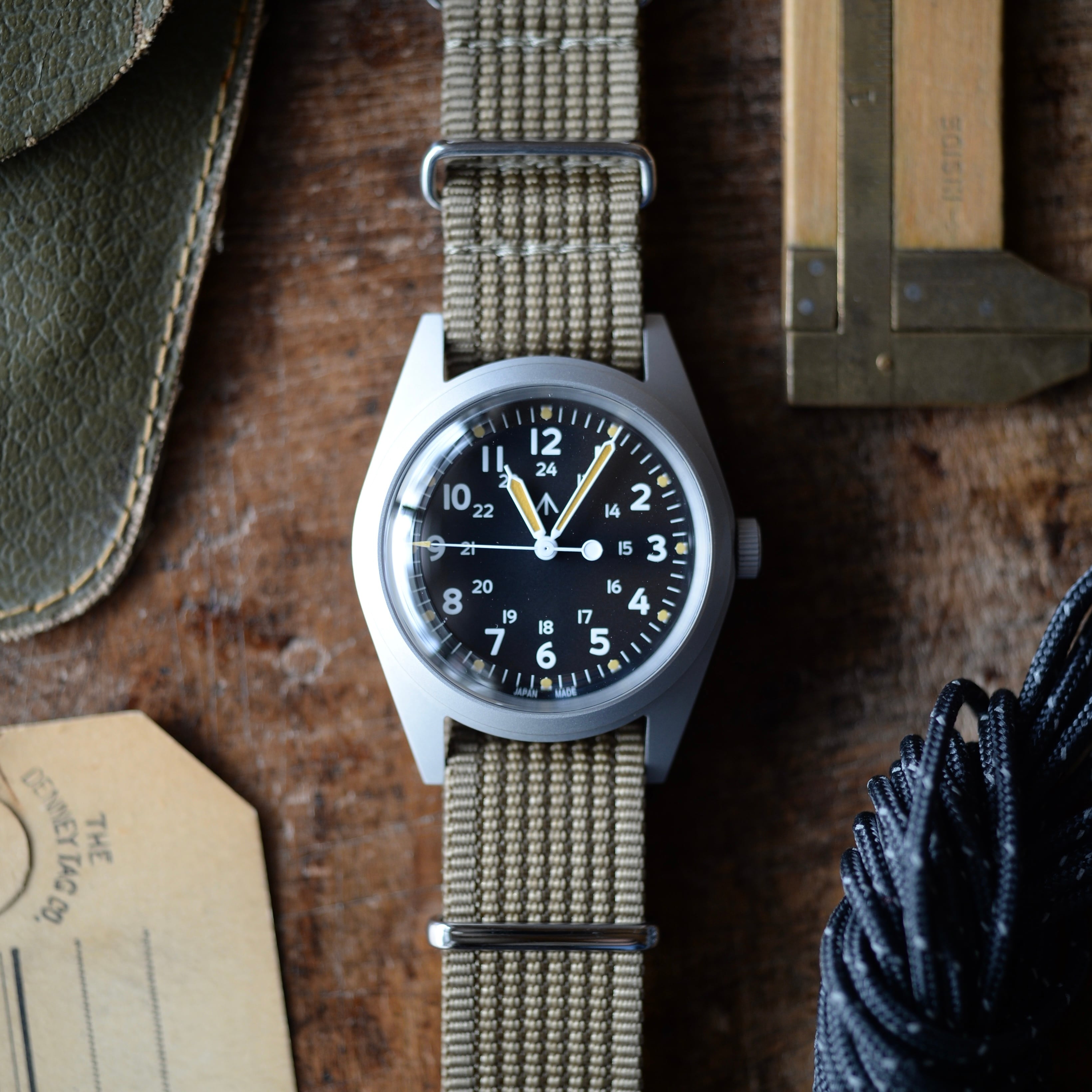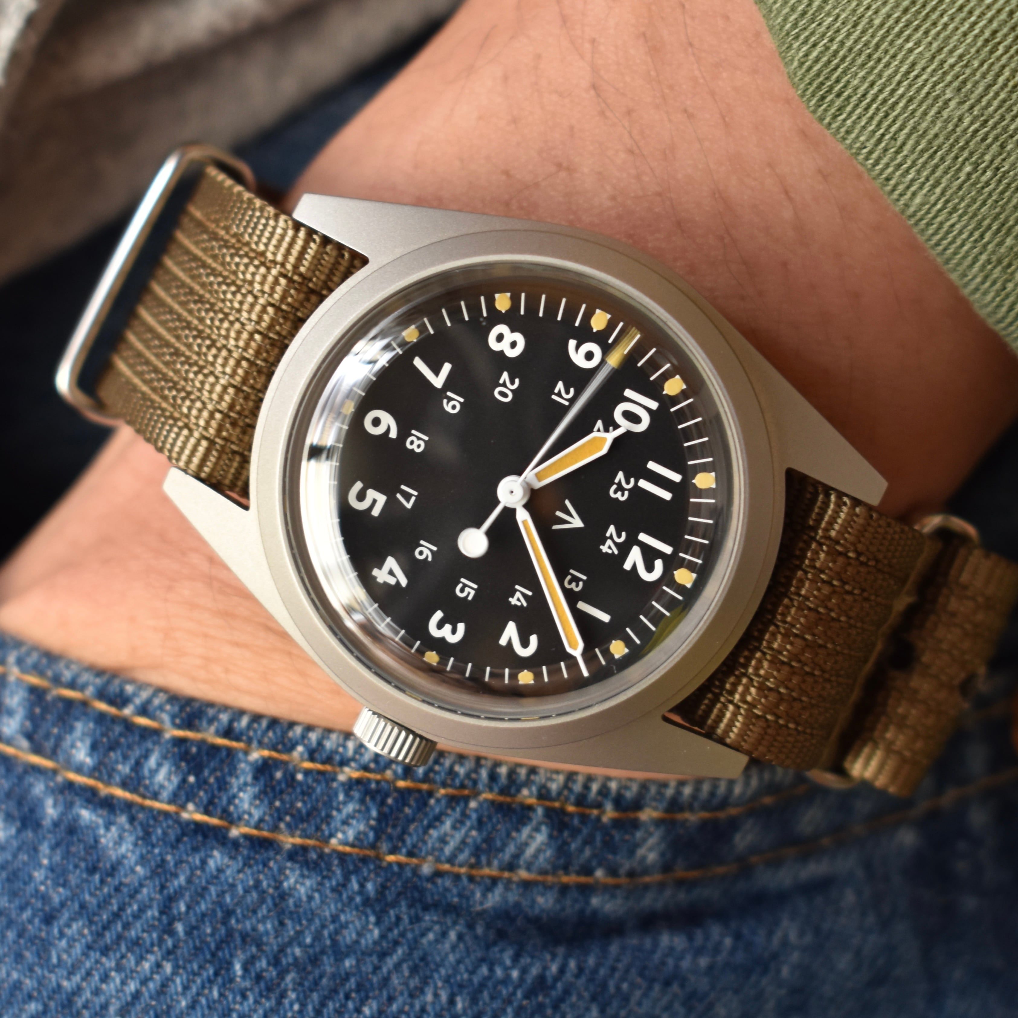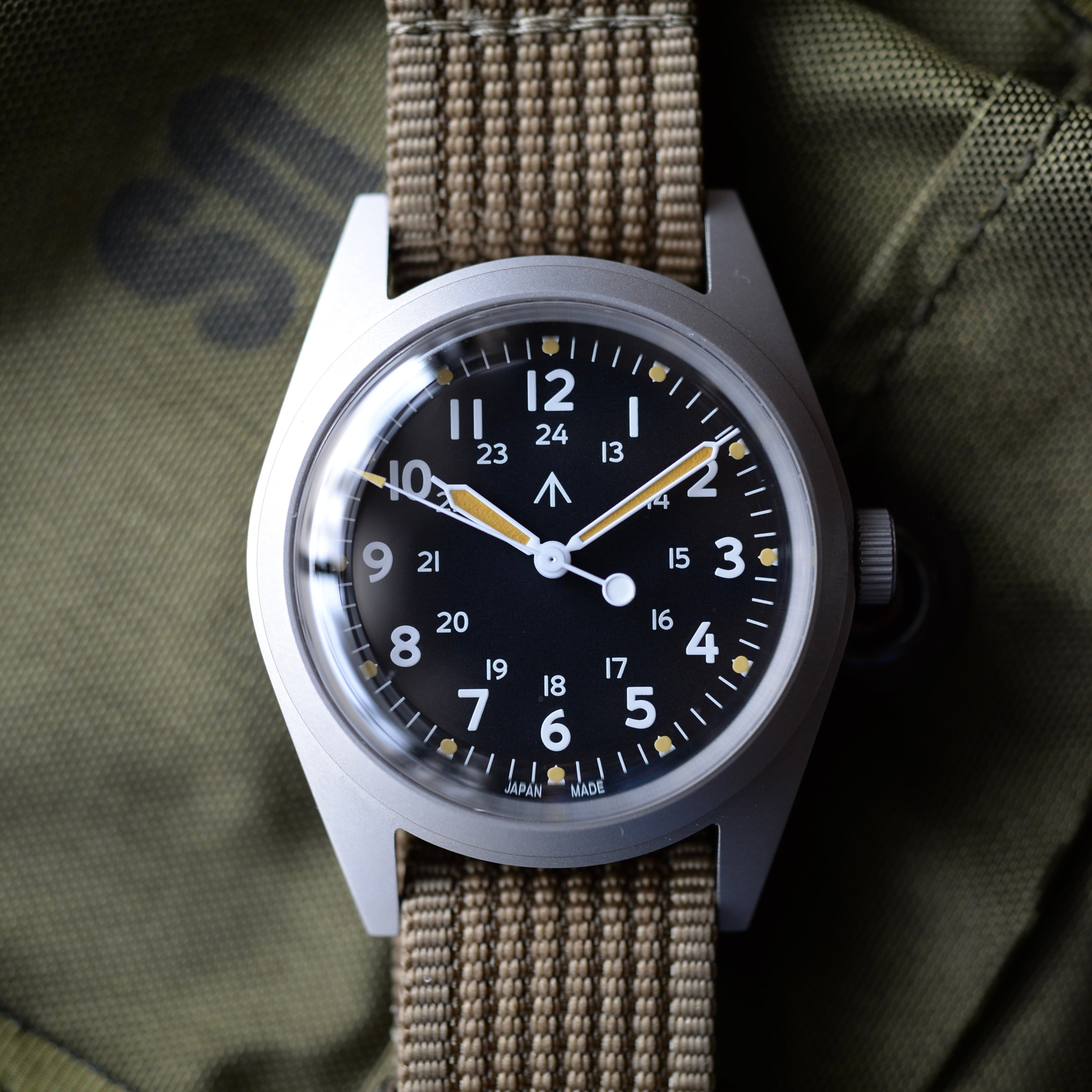 1960代後半から70年代中頃までベトナム戦の時代にアメリカで各社時計メーカーが米軍から要請を受けて納品していたGG-W-113をベースにしています。