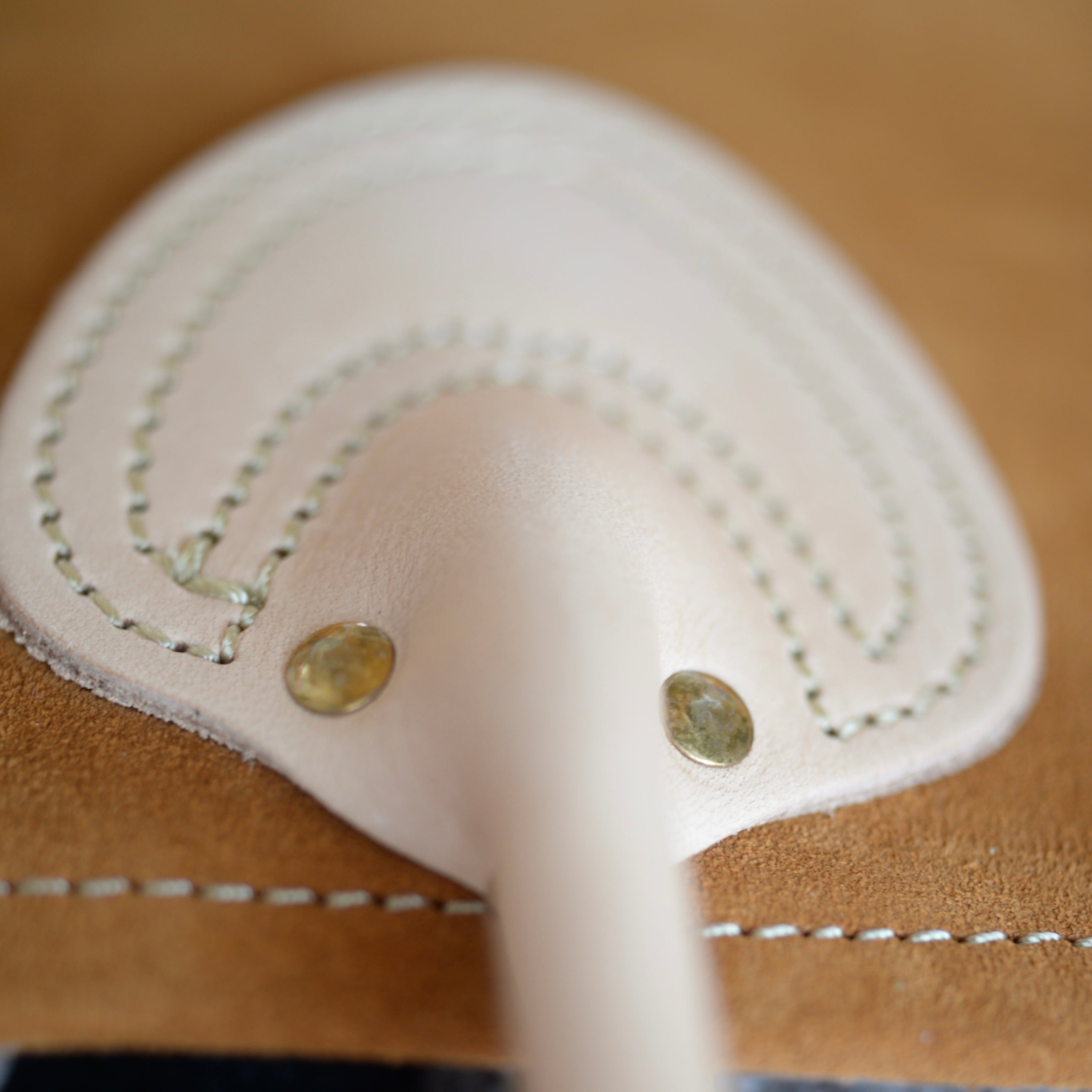 ハンドル部分は栃木レザーのヌメ革を使用しており縫い合わせた後、コバを磨くことで、美しくソフトな手触りになっております。