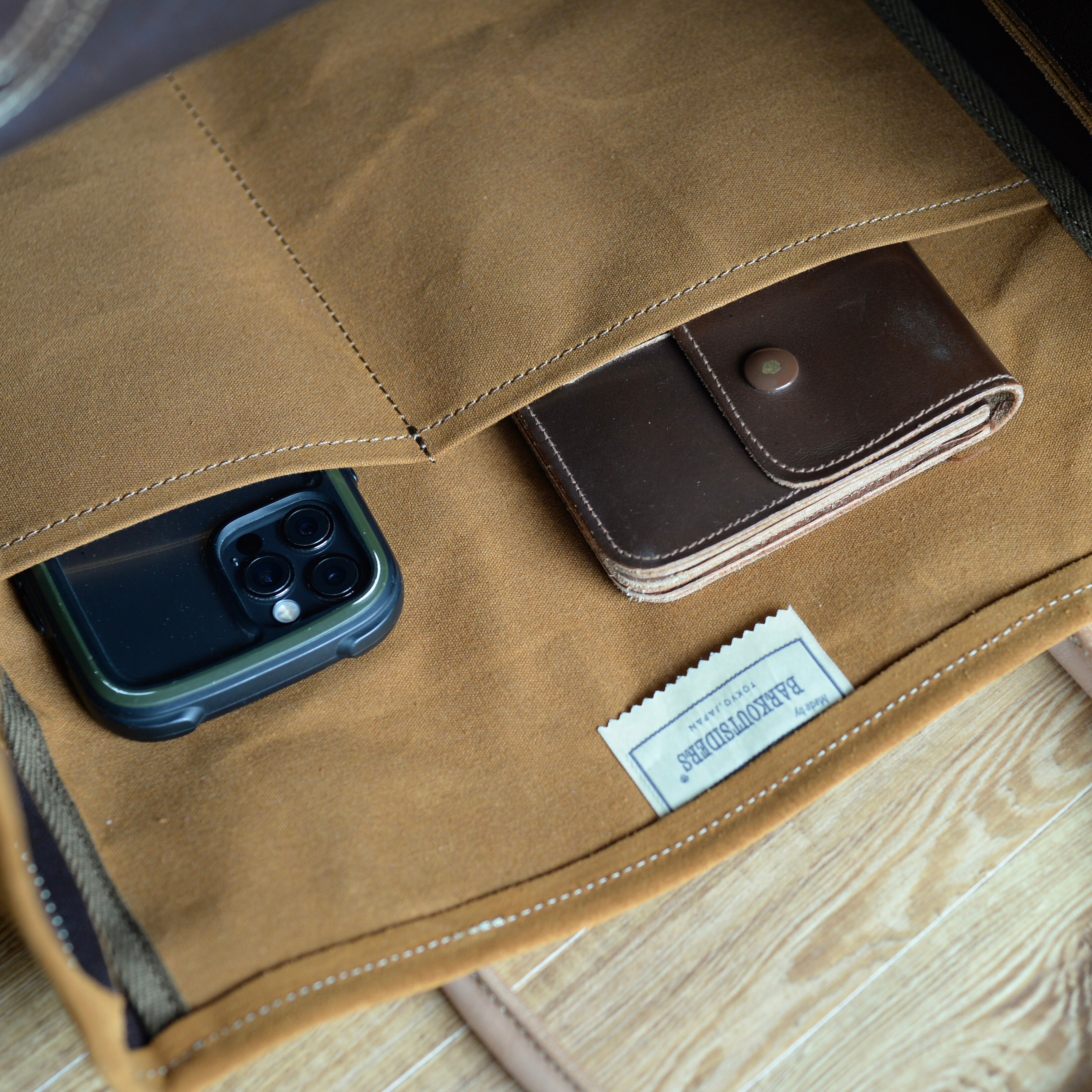 パラフィンキャンバスの生地や杉綾テープも風合いを生かしたディテールが特徴です。