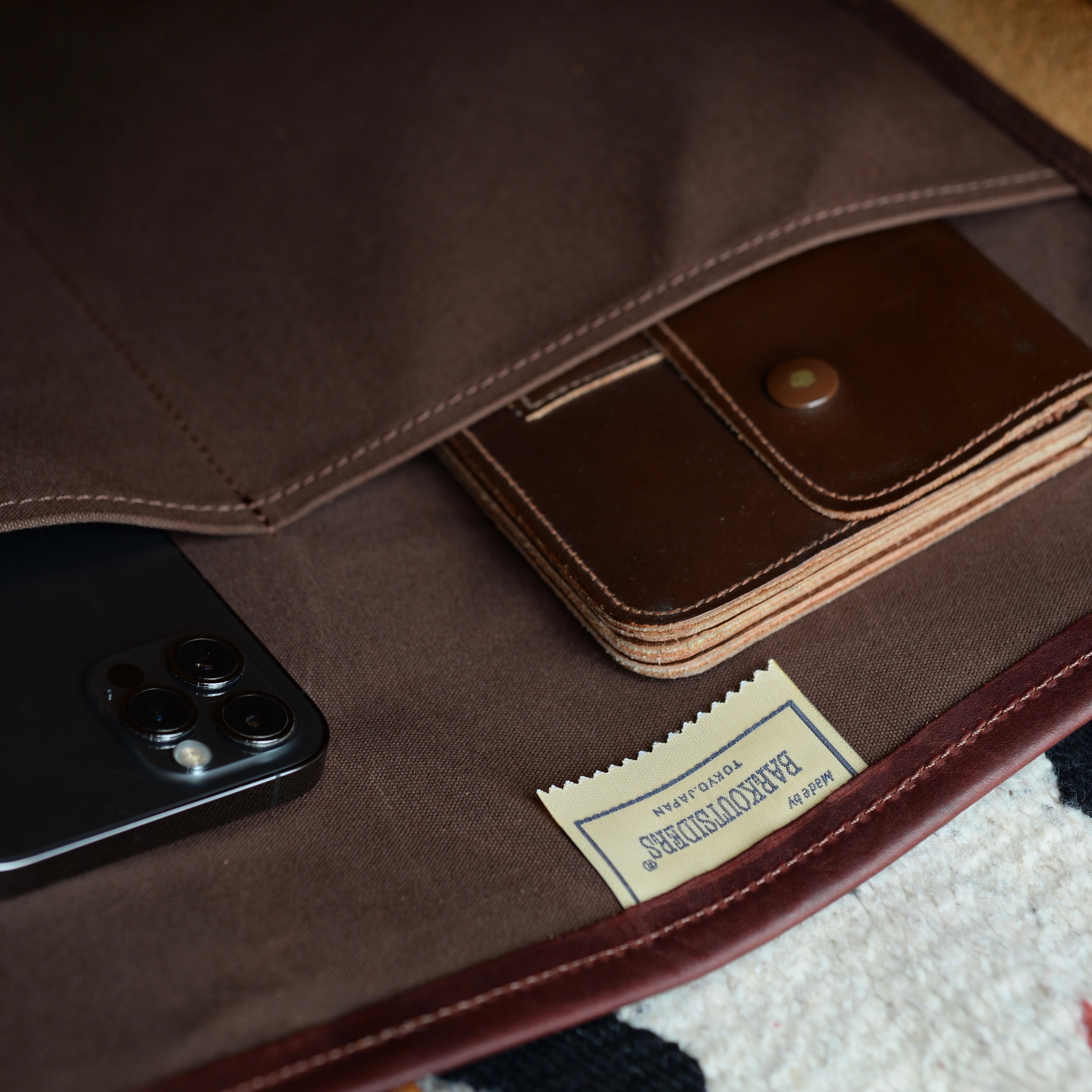 裏面地色が茶色になっている為、使い始めはポケット地に茶色い革の繊維が付く可能性があります。使っていくうちに付着しにくくなっていきます。