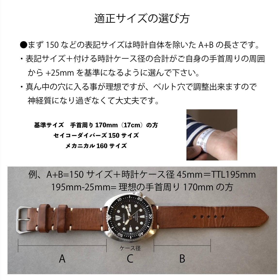 サイズ表記は時計のケース径を抜いた尾錠からベルト穴の真ん中までの長さです。